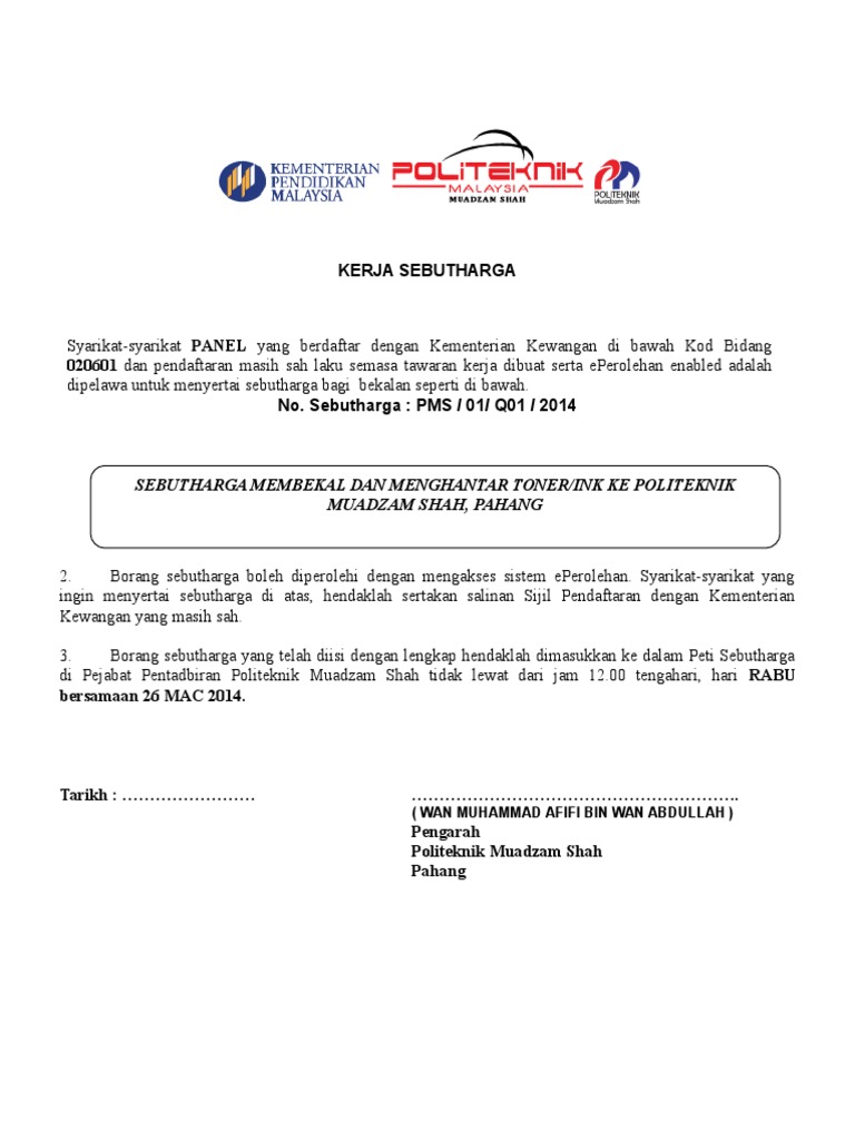 Sebutharga Membekal Dan Menghantar Tonerink Di Politeknik Muadzam Shah Pahang Pdf
